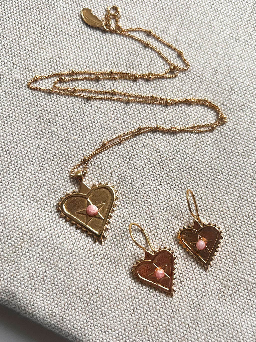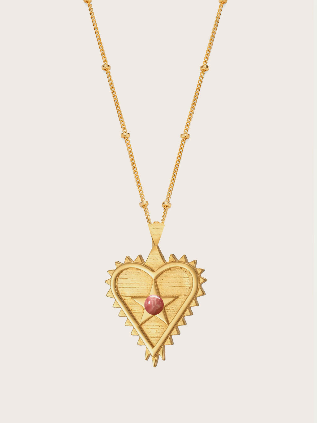 The Jagged Heart Necklace is made from gold plate over sterling silver on a 18" satellite chain, with a Rhodonite stone in the center of the pendant.