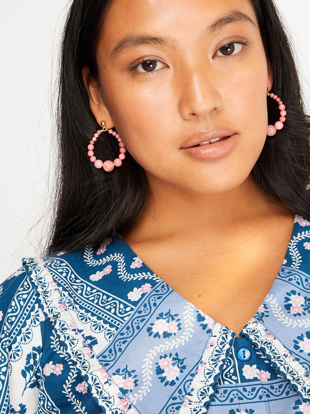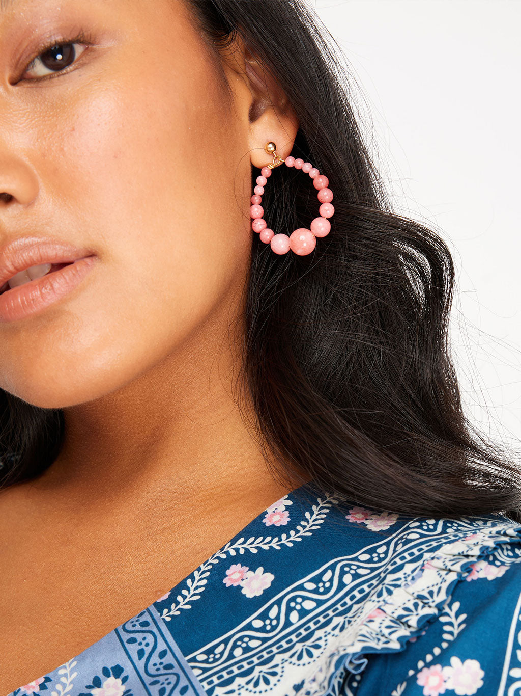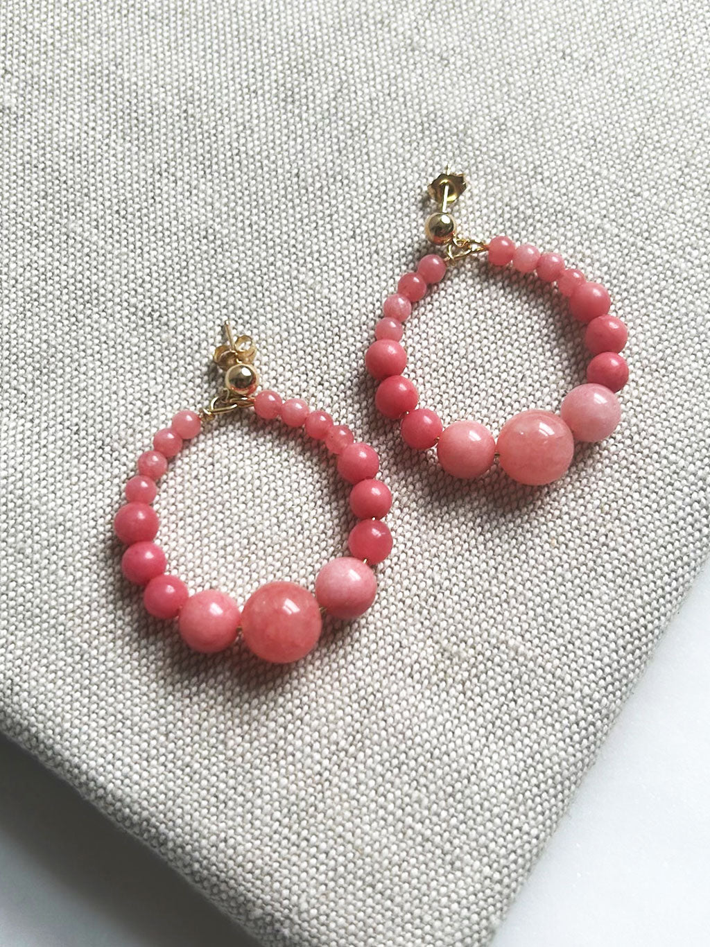 The Lulabelle Earrings are made using Rhodonite, a smooth round semi-precious stone. Each pair has been made by hand by Harry Rocks designer, Laura with a gold plate over sterling silver stud earring, with graduated sized Rhodonite beads.