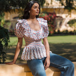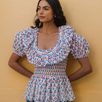 The dramatic scoop neckline is edged in an oversized ruffle and sits over a smocked bodice. Made from our beautiful pink and blue dandelion block print in organic cotton, it has puff sleeves, and has a gathered peplum that sits at the hip, finished with a beautiful broderie anglaise-edged hem.