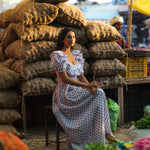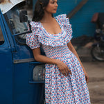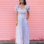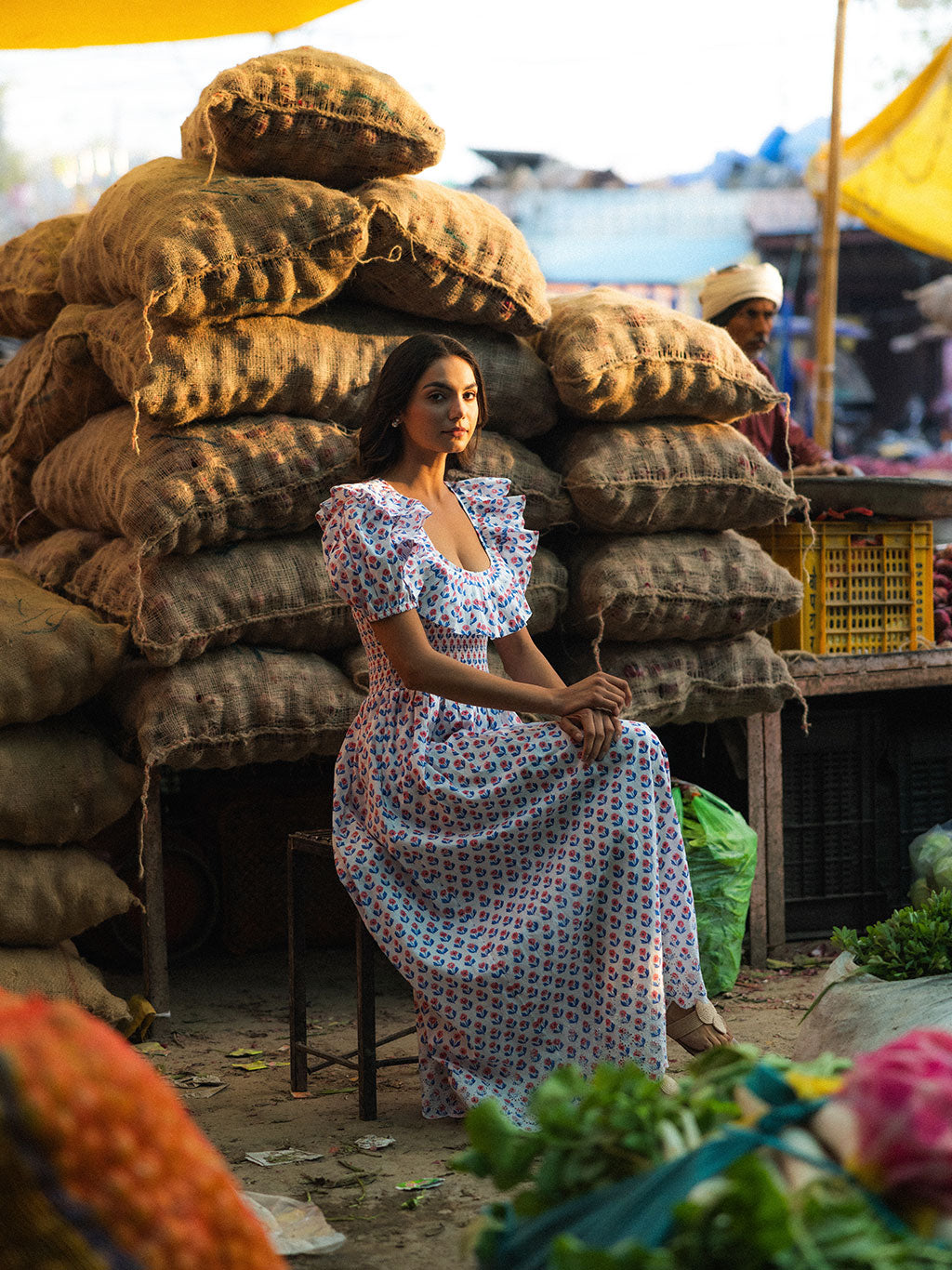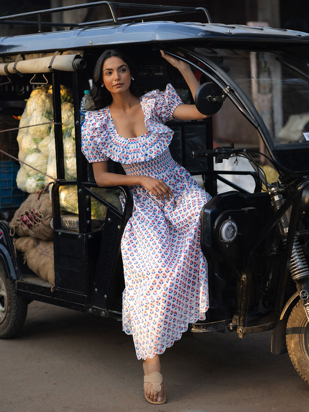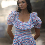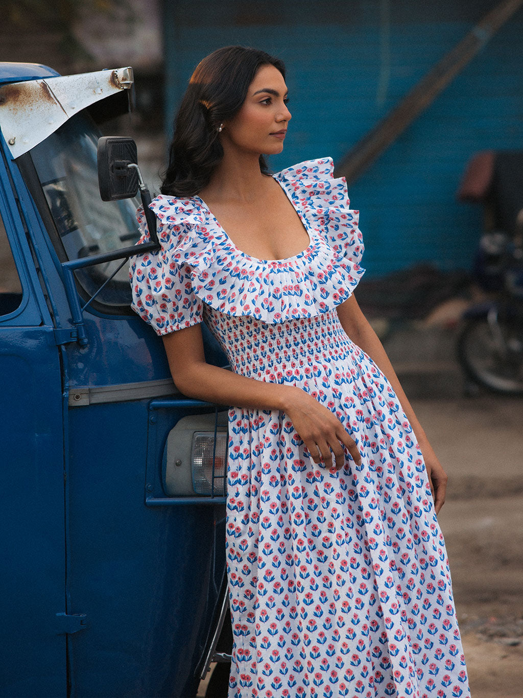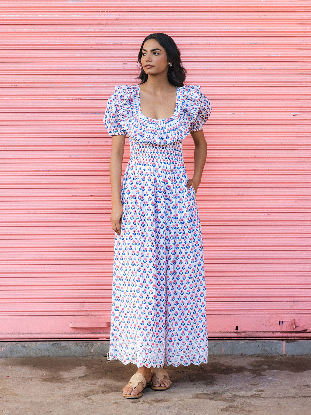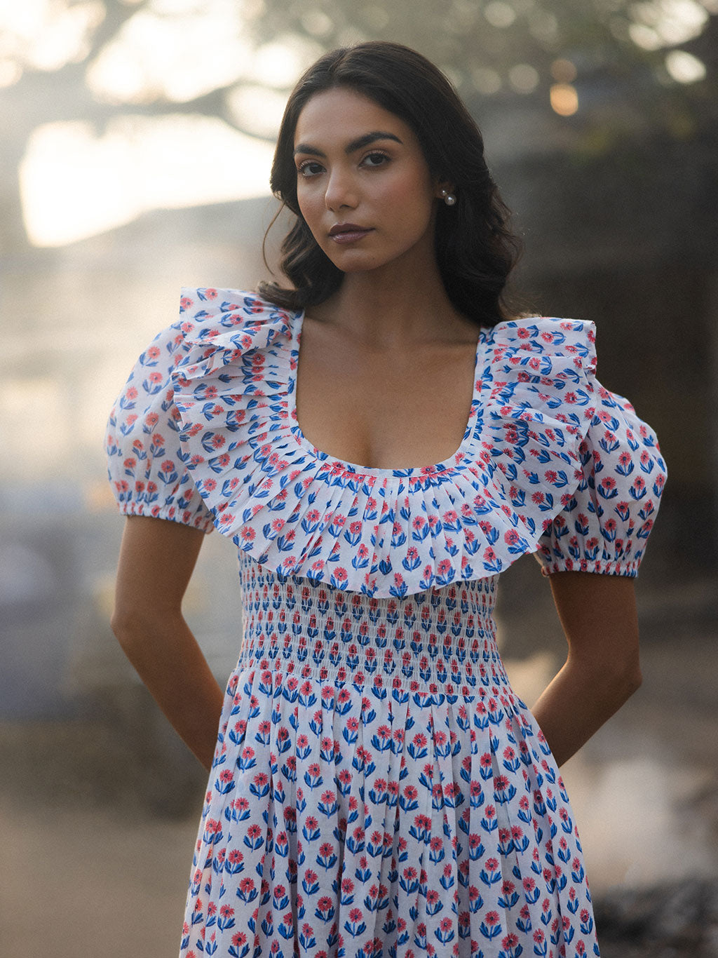 The dramatic scoop neckline is edged in an oversized ruffle and sits over a smocked bodice. Made from our beautiful pink and blue dandelion block print in organic cotton, it has puff sleeves, a long full skirt and is finished with a beautiful broderie anglaise-edged hem.