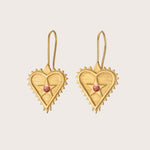 The Jagged Heart Earrings are gold plate over sterling silver with a Rhodonite cabochon stone in the center.