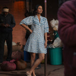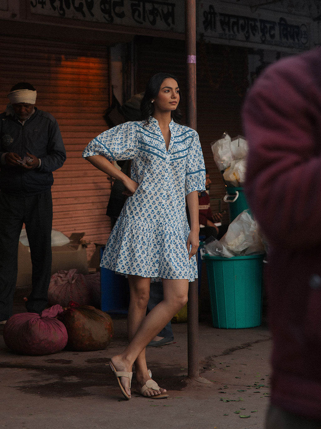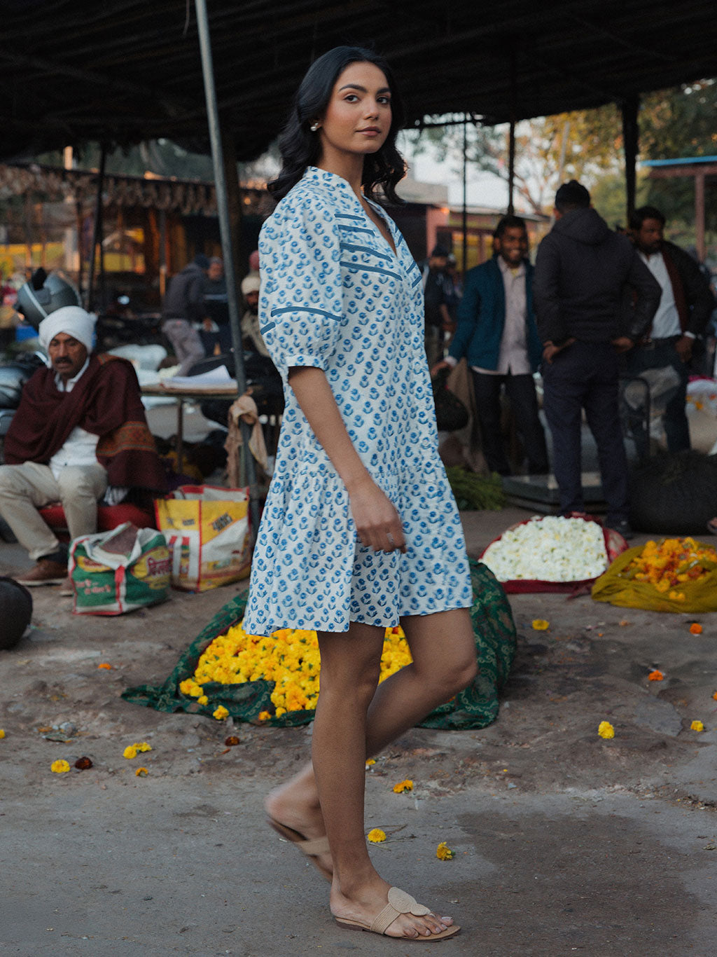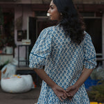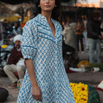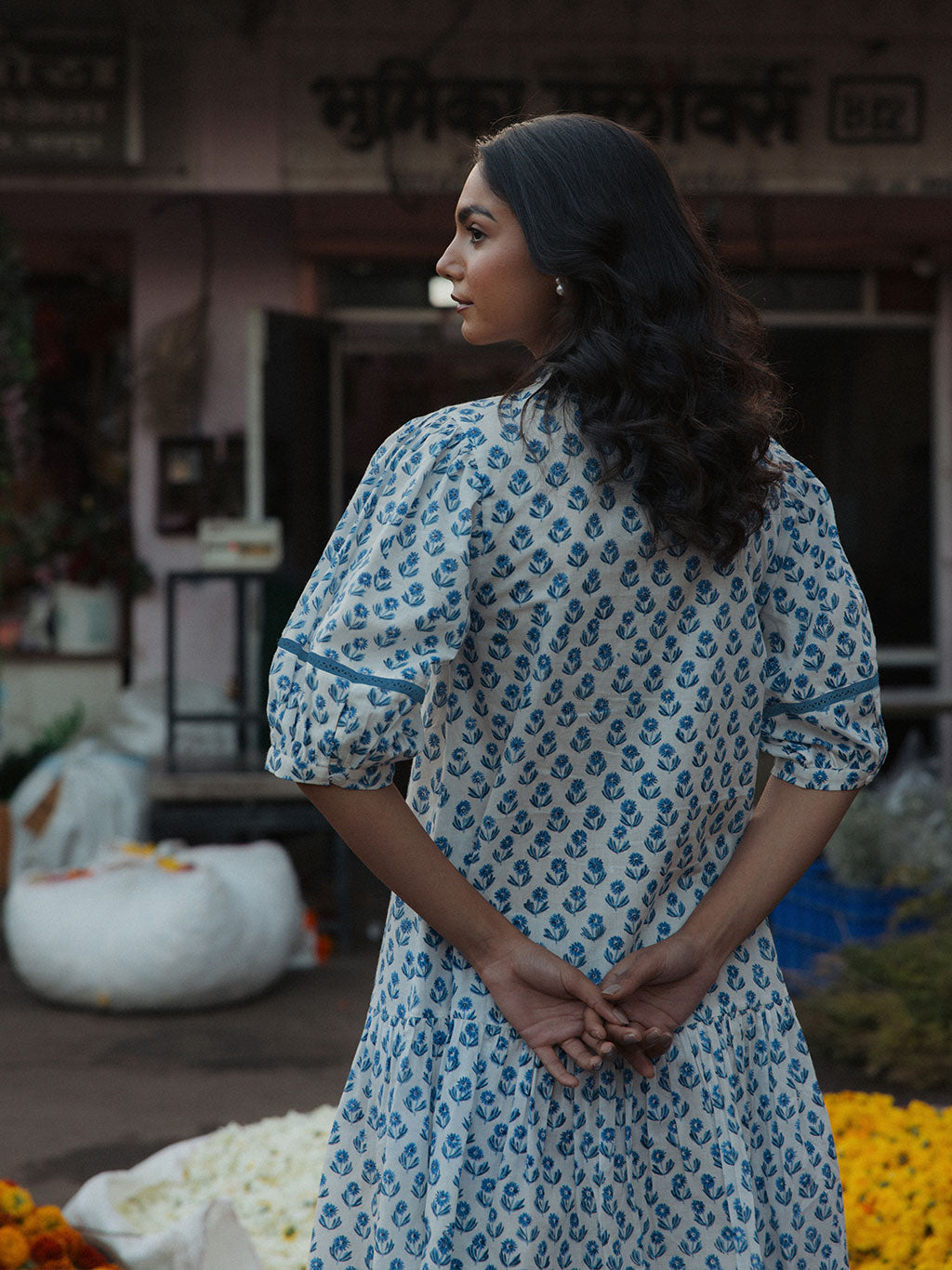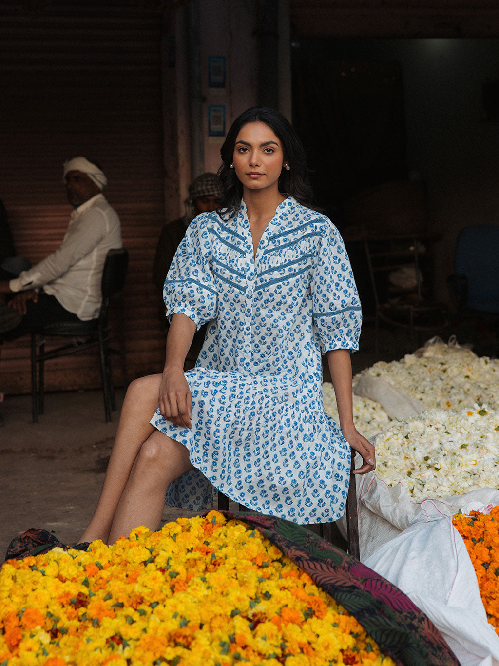 The Pippa is back in a gorgeous new blue dandelion block print and has pretty lace insert panels in dark blue. It has a deep v neck, balloon sleeves and a button-through front.