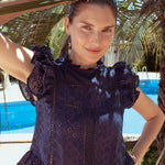 We are excited to introduce the Sasha top, a completely new style for this collection. Made from a pretty cotton eyelet fabric, featuring lace inserts and a double ruffle on the shoulder, it is the white top that every summer wardrobe needs. It has a ruffle around the neck and a ruffled peplum at the waist.