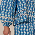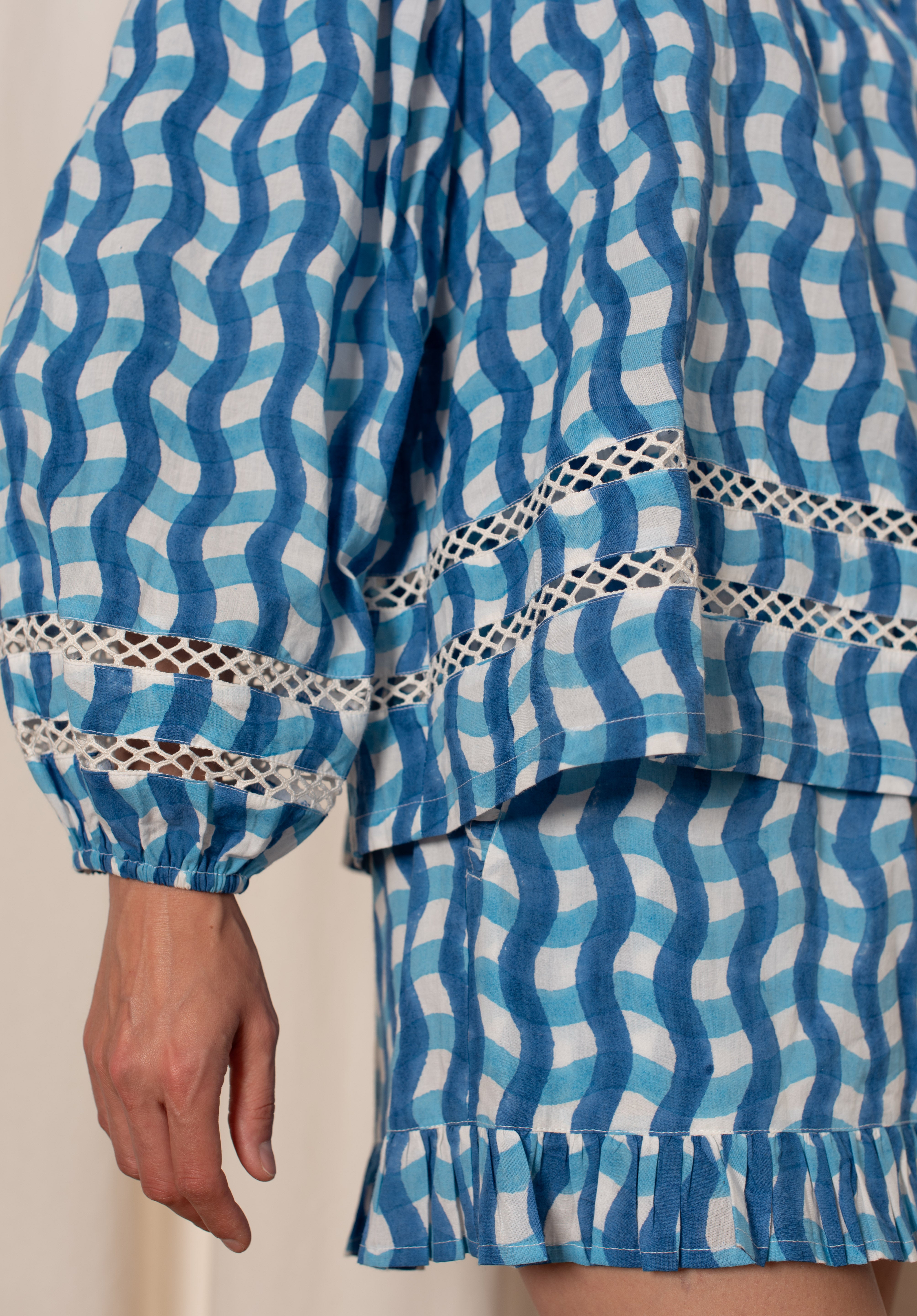 The Violet top in our blue zigzag block print is an easy, pull over the head style and has a square neck with pintuck detail and long balloon sleeves with elastic cuffs.
