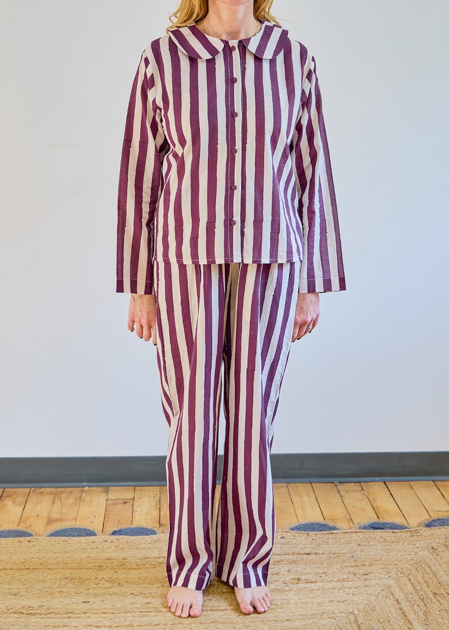 Pretty design features include a Peter Pan collar and contrast fabric-covered buttons. Like everything we make, the pajama trousers feature pockets.
