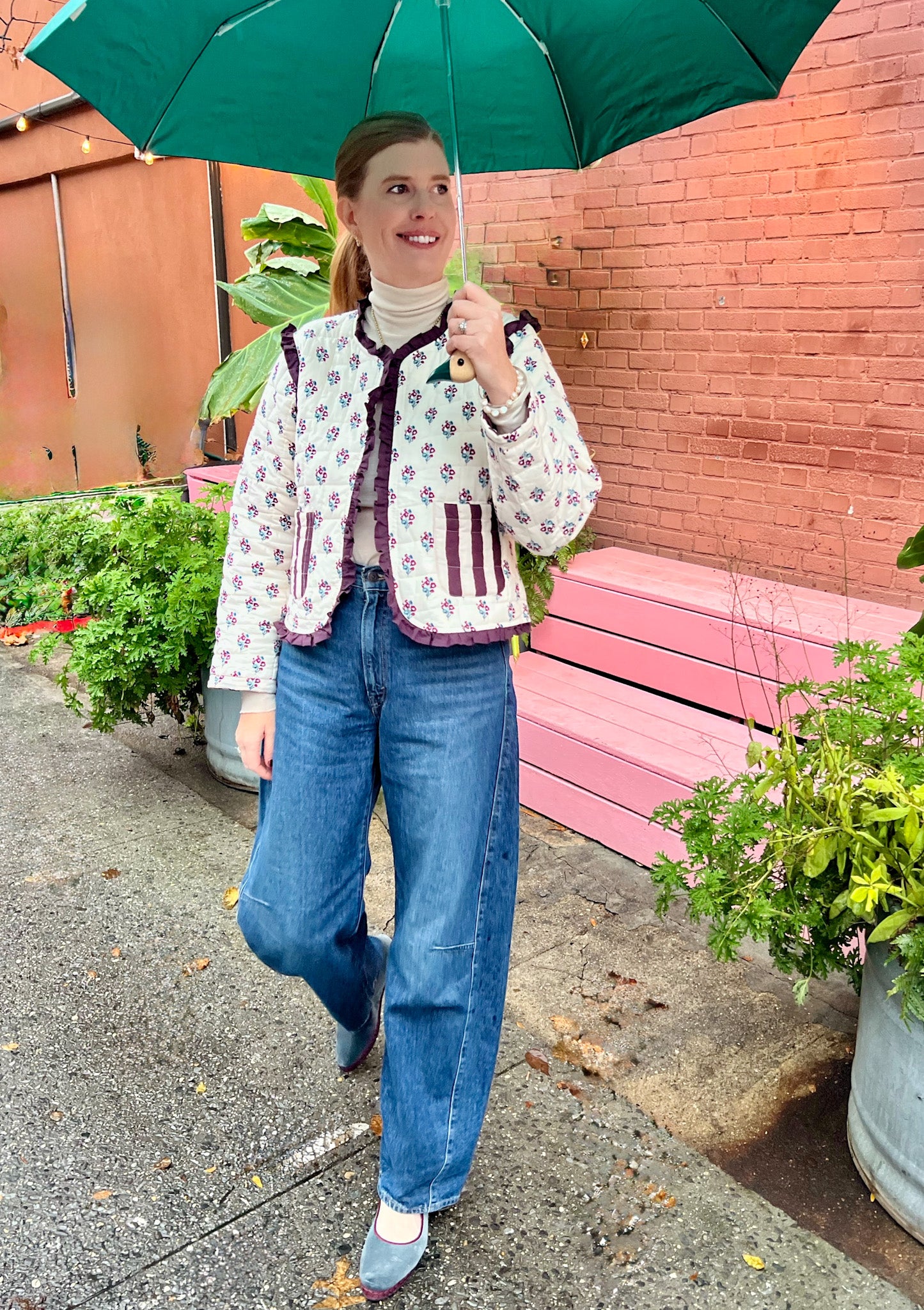 The Emmie is fully reversible with contrast pockets and features our burgundy and cream block print on one side and our cream vintage floral block print on the other.