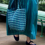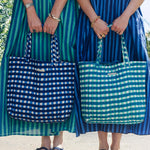 The bags were styled with our new Natalie sundress (the green stripe version worn as a skirt) and the Lara dress in our geo print.