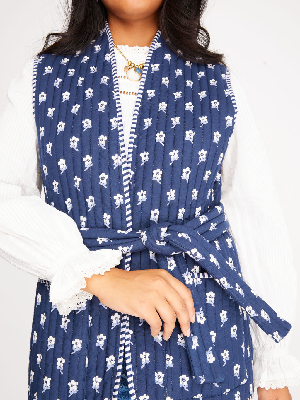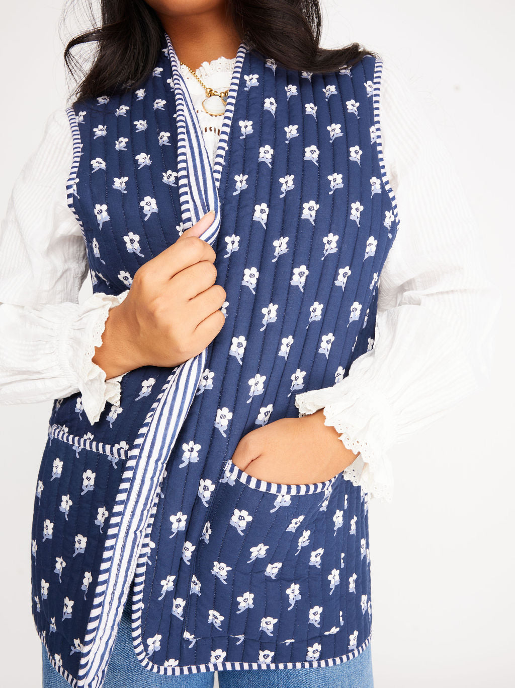 The sell-out Paloma vest is back in a beautiful navy floral block print for Fall with a coordinating stripe on the reverse.