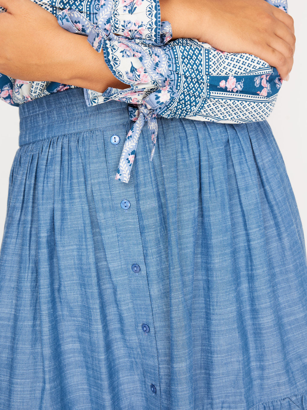 The skirt is maxi length (see measurements below) with button through detail, a frilled tier and a gathered elasticated waistband for the perfect polished yet, comfortable fit. As you'd expect, it has pockets!
