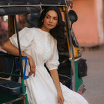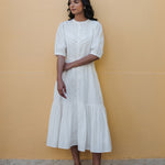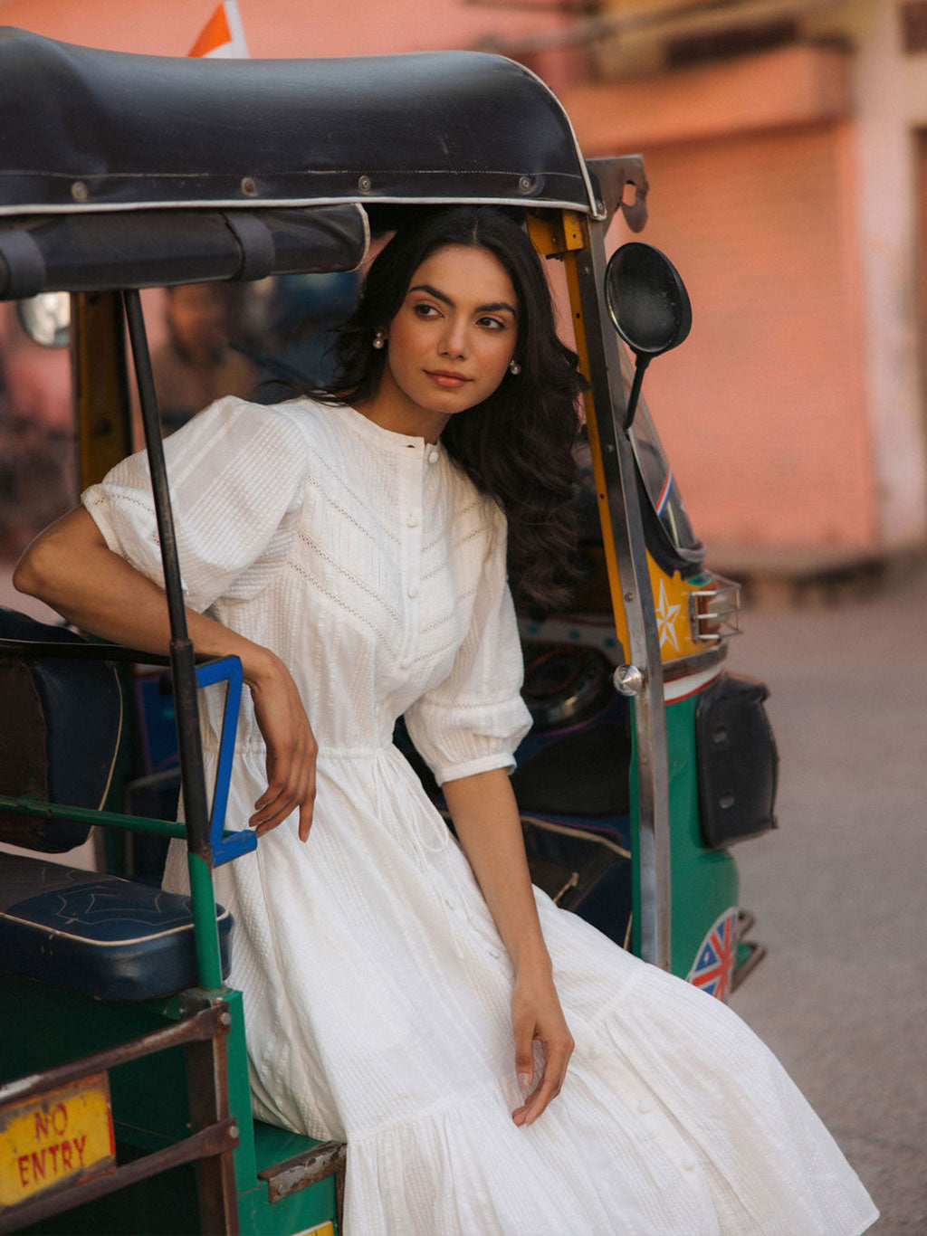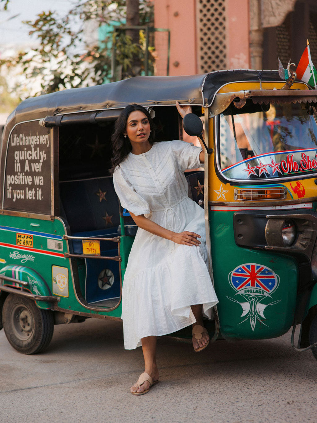 The Holly is made from a gorgeous cotton seersucker with a self-stripe and has pretty lace insert panels. It has fabric covered buttons, balloon sleeves, an adjustable tie waist and pockets.