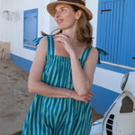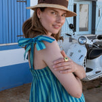 We love the bold block print stripes contrasted with the relaxed simplicity of the style. The adjustable tie straps are attached to a gathered elastic panel and the overall silhouette is laidback and extremely comfortable.
