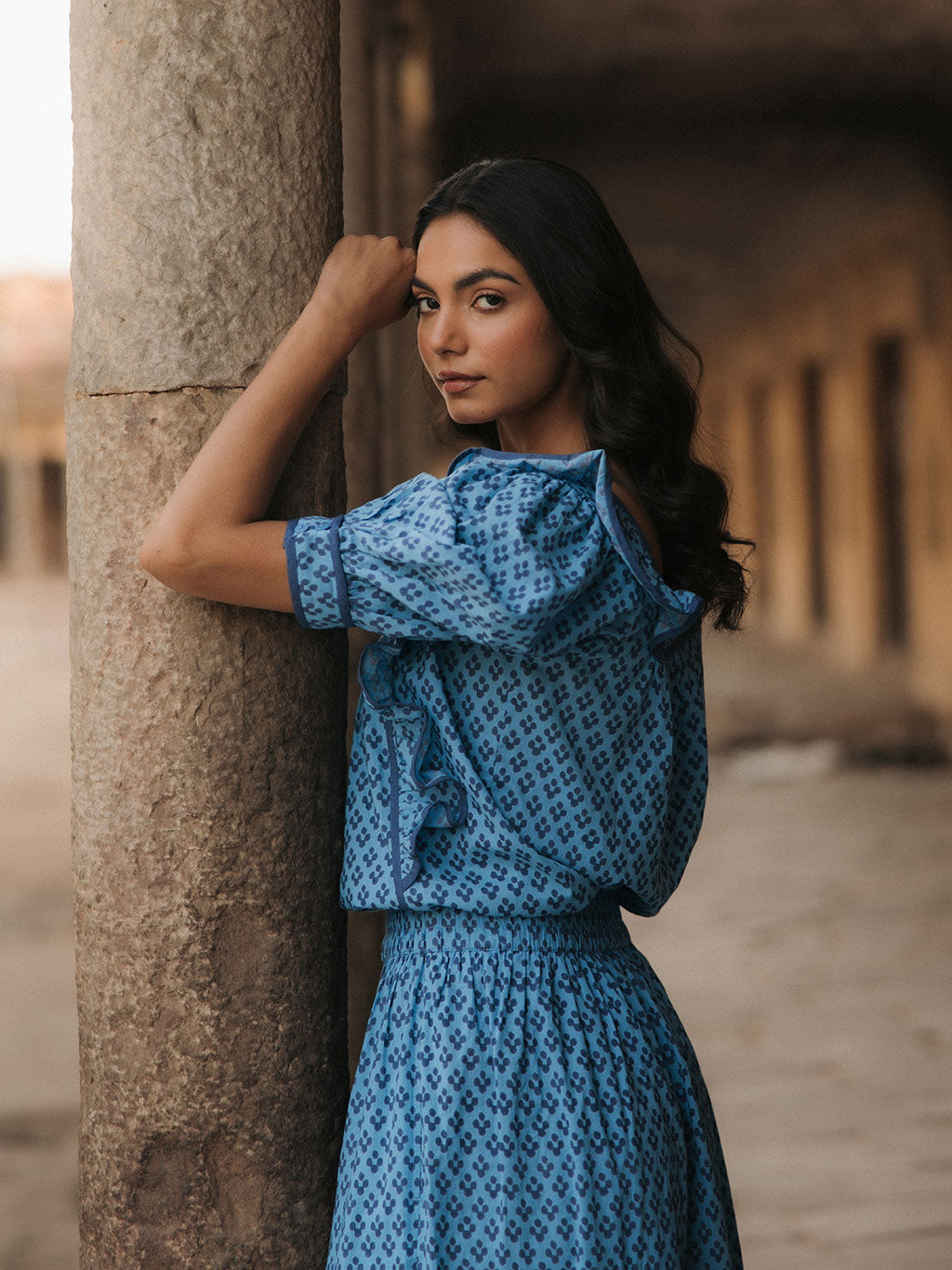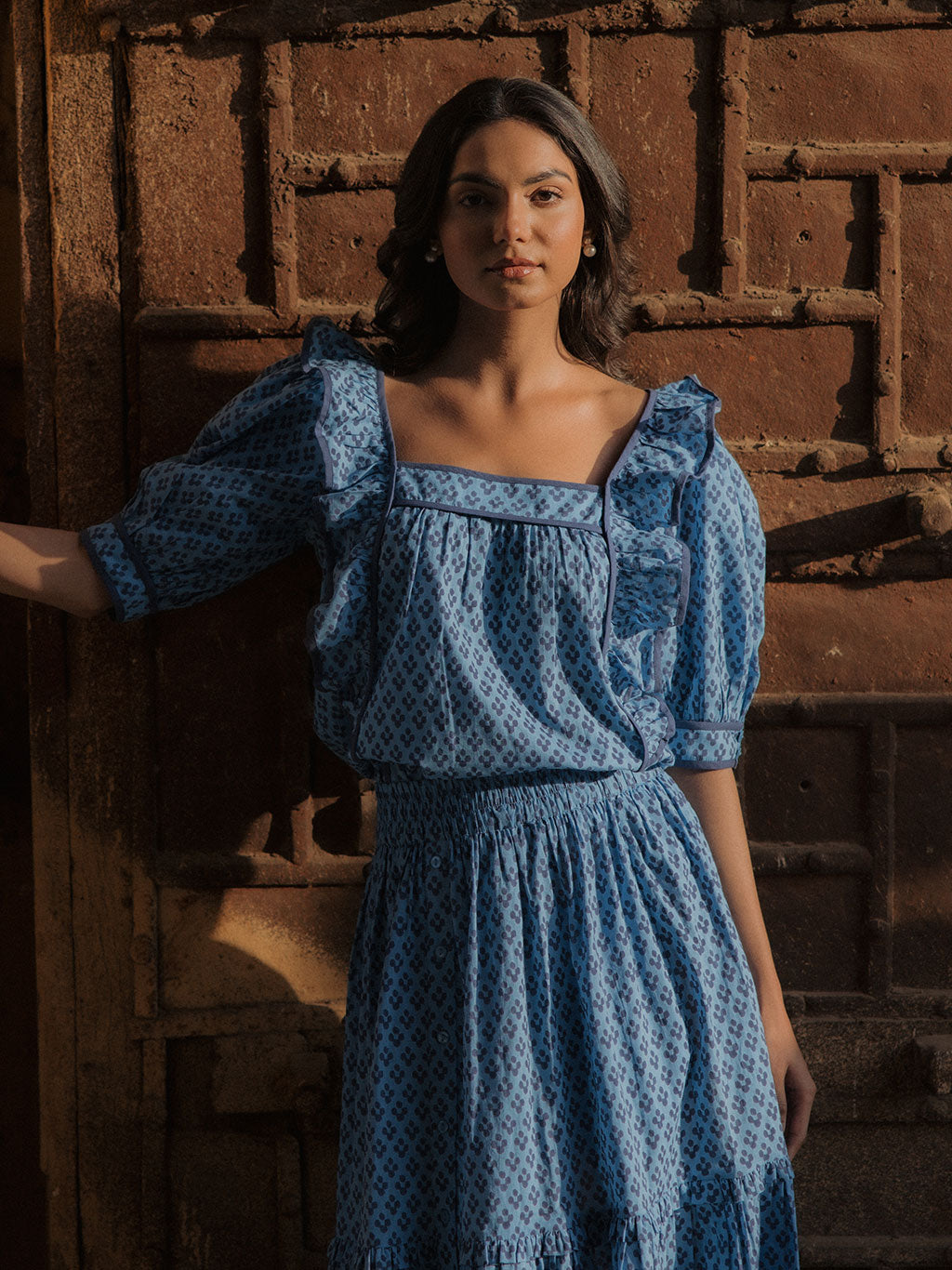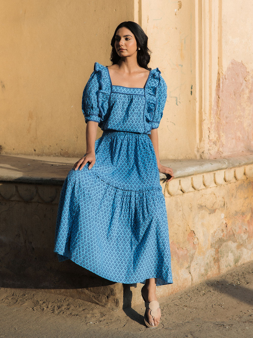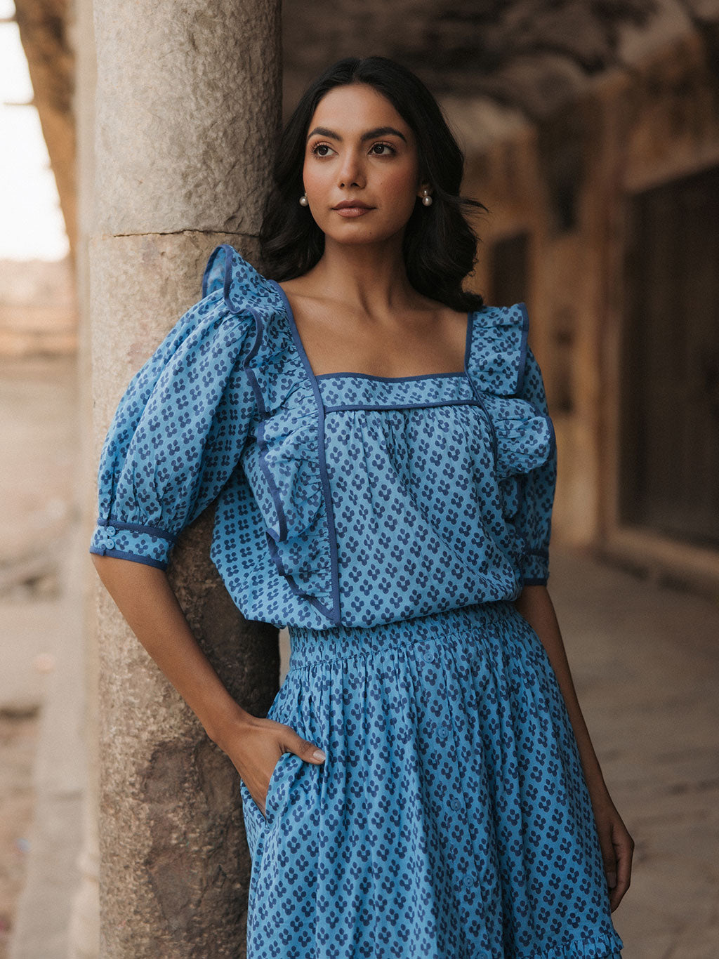 With wearability always front of mind, we wanted to created a top that you could pull on and feel instantly put together. Like the matching Jeannie skirt, the Mae top is made from our stunning blue diamond block-printed organic cotton and has darker blue contrast accents throughout.