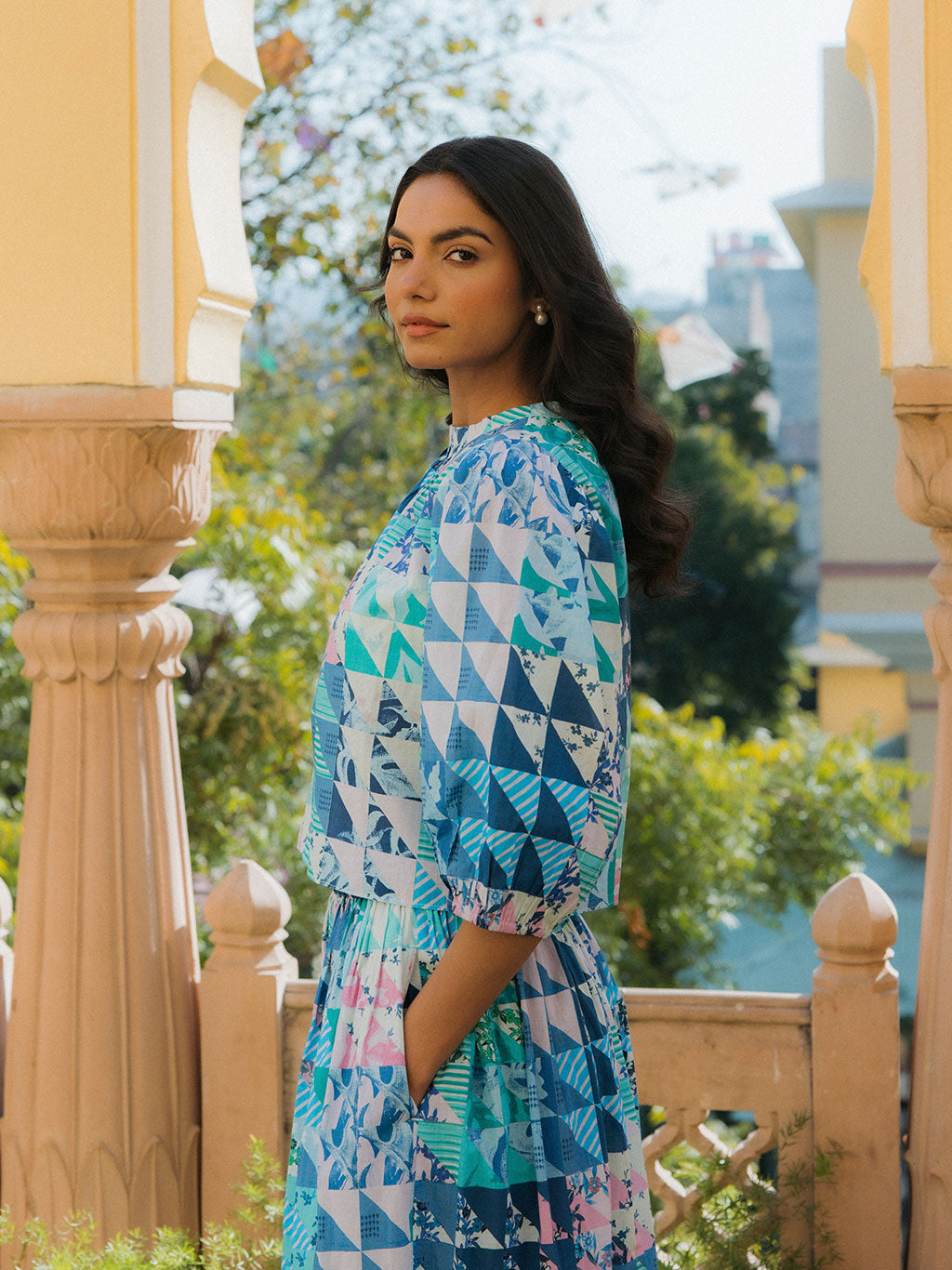The Mimi separates have become an O&I staple and we can't wait to wear them in this new green and blue geo print. The set includes a relaxed top with an oversized puff sleeve and a matching maxi skirt. Purchase and wear together as one show-stopping outfit or separately and style in multiple ways.