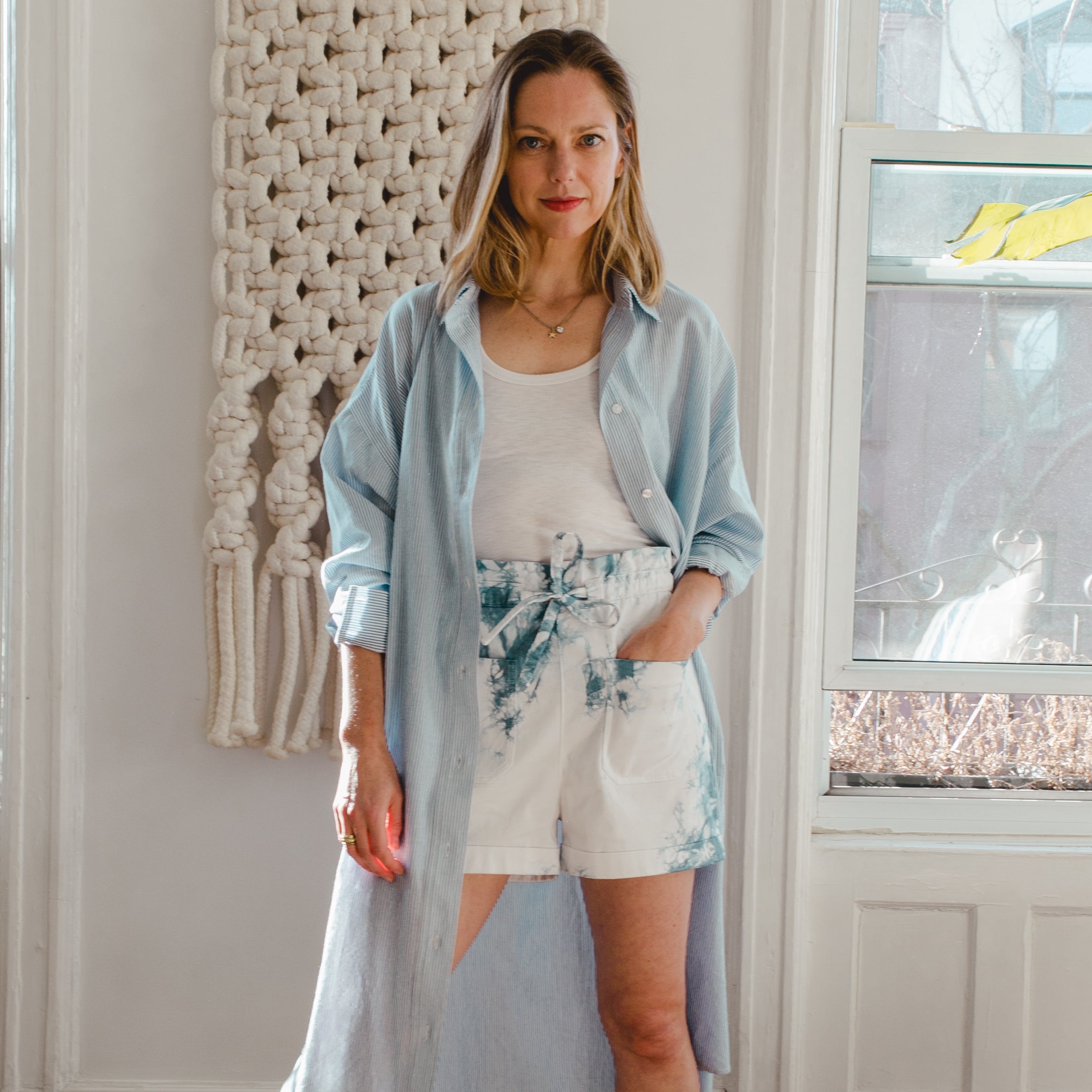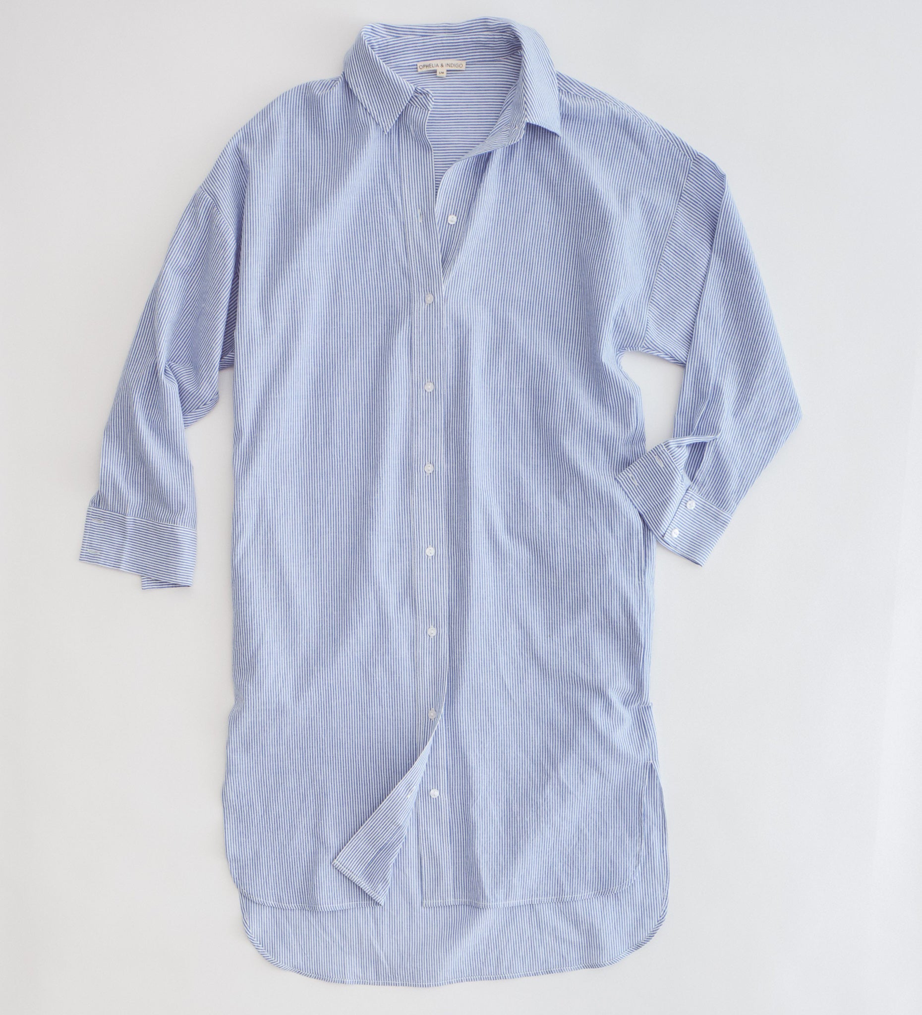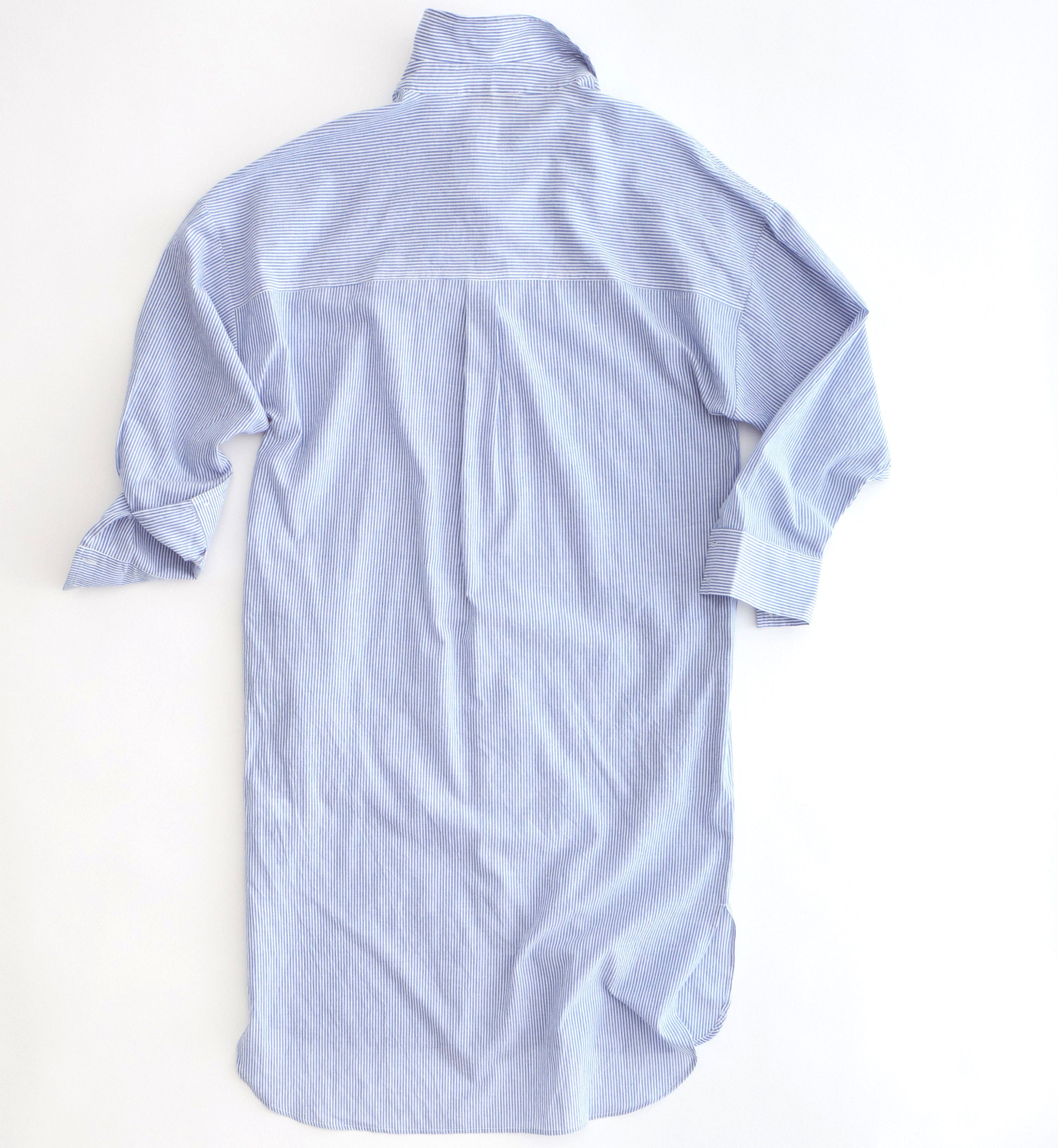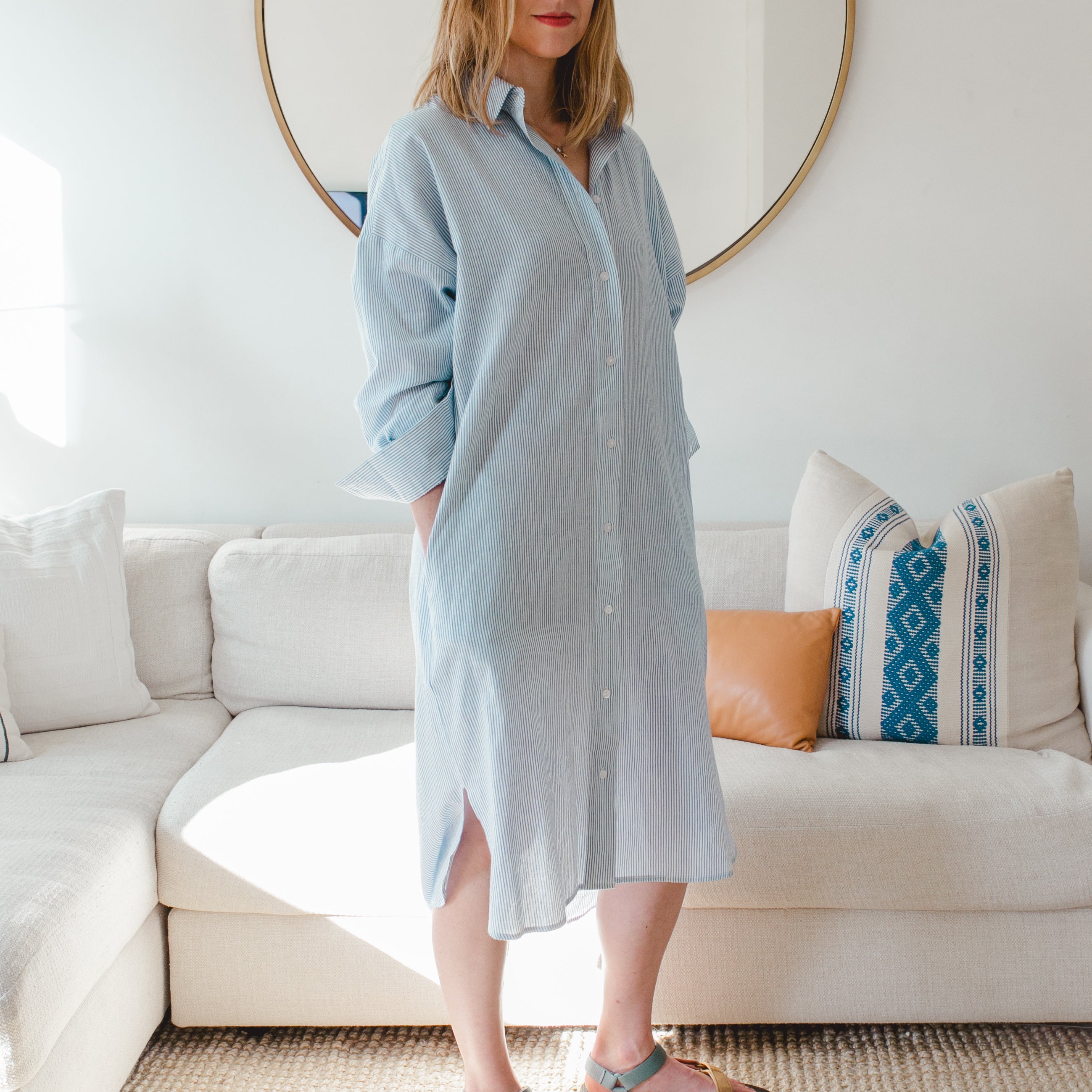 The O & I shirt dress. We've taken the shirt dress and reimagined it with a more relaxed fit. We love the deep cuffs, the deep yoke at the back and the softness of the cottons that we sourced to produce it in. Oh, not forgetting the pockets.